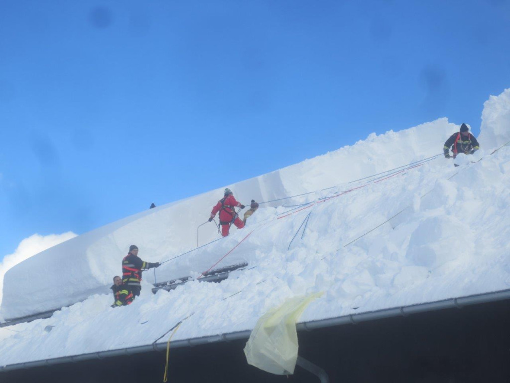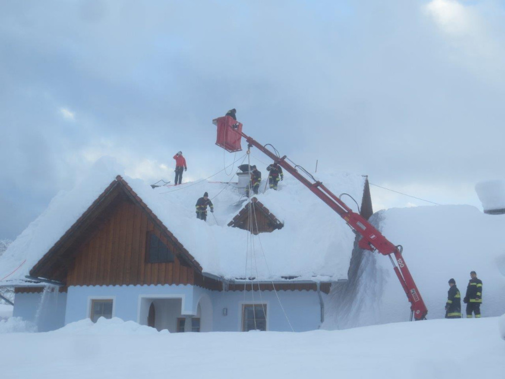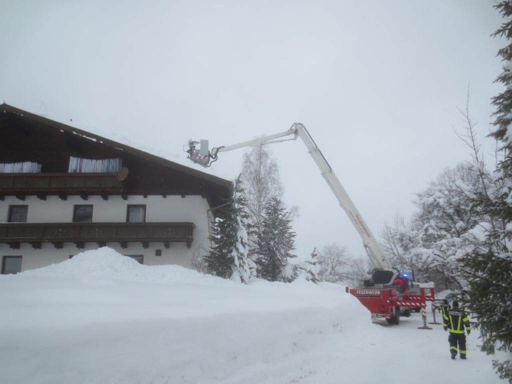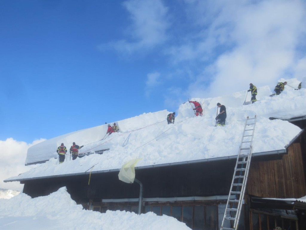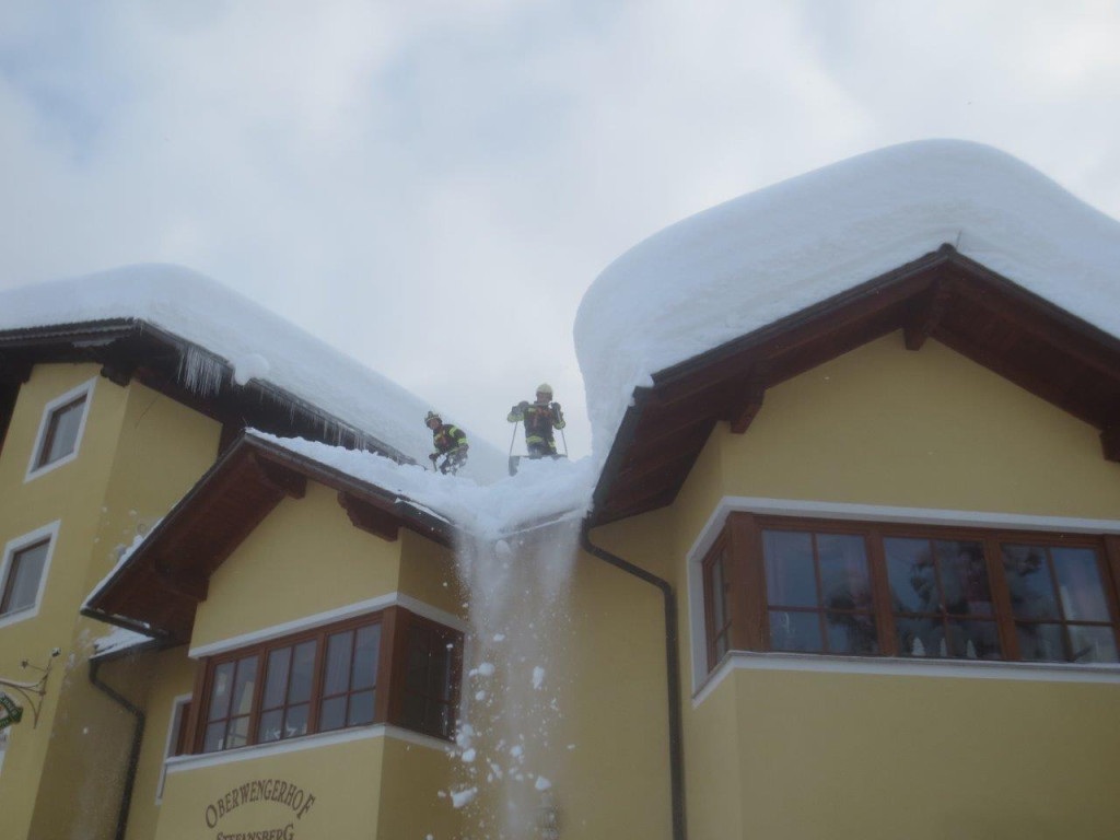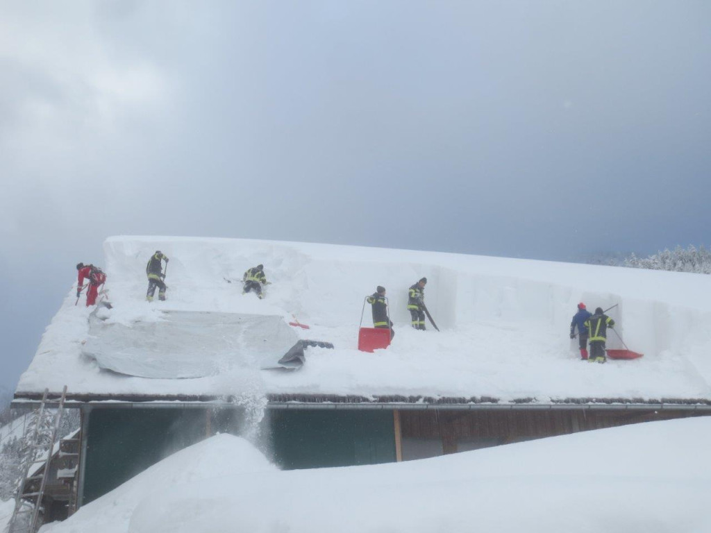 Dort angekommen werden die Einheiten in Abstimmung mit den anderen Einsatz-Organisationen aufgeteilt und den jeweiligen Objekten zugeordnet. Je nach Dringlichkeit gilt es die Bauwerke von dem vielen Schnee zu befreien um den „Druck“ in den Dach-Konstruktionen zu entlasten und Schlimmeres zu verhindern. Auf den Dächern befinden sich teilweise über 2 Meter Schnee, welcher von Kameraden mit Schneeschaufeln abgeräumt werden. Aufgrund der Steilheit der Dächer und der Schneehöhe welche mittlerweile zusammengekommen ist, geht dies nur mittels Seilsicherung.
