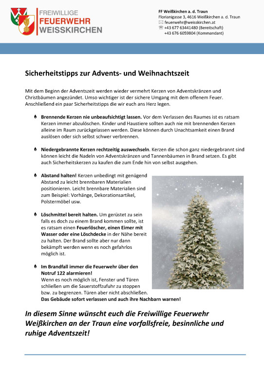 Mit dem Beginn der Adventszeit werden wieder vermehrt Kerzen von Adventskränzen und Christbäumen angezündet. Umso wichtiger ist der sichere Umgang mit dem offenem Feuer. Anschließend ein paar Sicherheitstipps die wir euch ans Herz legen.