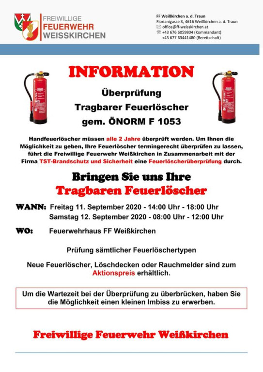 Wir können euch endlich den neuen Termin für die Feuerlöscherüberprüfung mitteilen. Diese findet in 2 Wochen am Fr, 11.09. und Sa, 12.09.2020 statt!