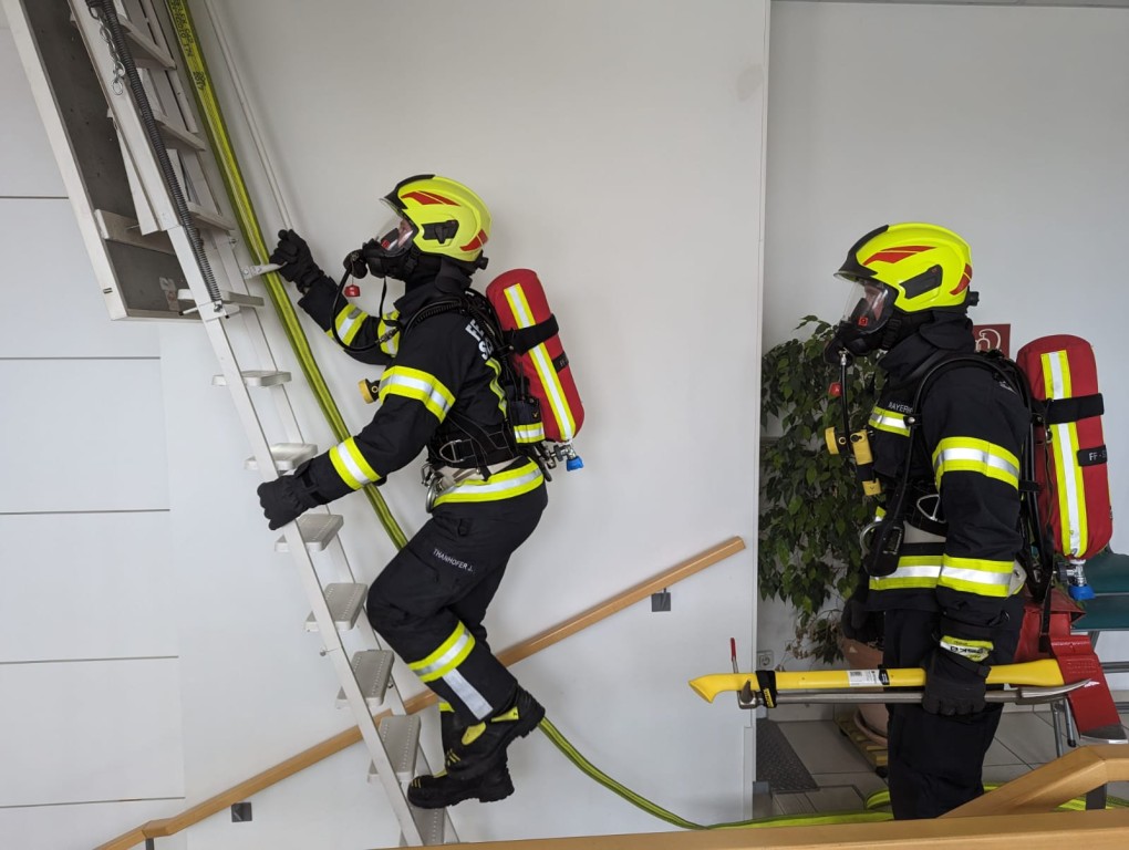 Übungsannahme war eine brennende PV-Anlage am Dach der Schule. Der Brand verursachte eine komplette Verrauchung des 2. OG, wodurch mehrere Schüler in zwei Klassen vom Brandrauch eingeschlossen wurden.