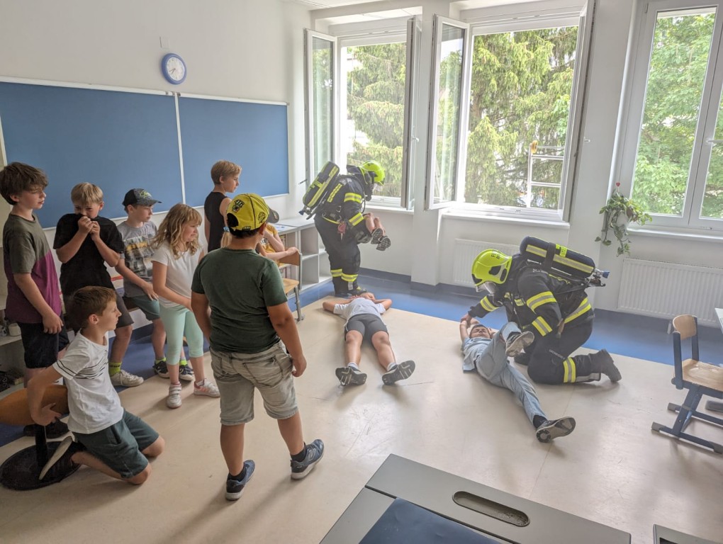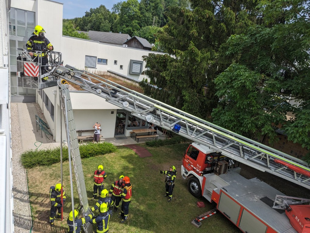 Hinter der Volksschule ist für die Drehleiter eine Aufstellfläche baulich vorgesehen worden, welche bei dieser Übung zur Anwendung kam. Durch die Drehleiter Marchtrenk wurden dann einige Kinder aus den beiden Klassen im 2. OG gerettet. Die restlichen Kinder wurden mit Fluchthauben durch Atemschutztrupps aus Weißkirchen und Marchtrenk über das Stiegenhaus gerettet.