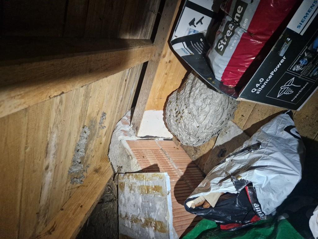 Am Einsatzort fanden wir ein Wespennest mit einem Durchmesser von etwa 45 cm vor. Durch das hohe Eigengewicht des Nestes, hatte dieses sich bereits vom Kaltdach gelöst. Die Reste des Nestes wurden mit den Wespen von den Kameraden aus dem Dachboden geholt.