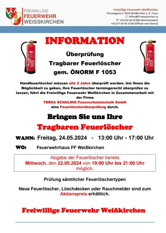 Die Überprüfung findet am Freitag den 24.Mai 2024 von 13:00 bis 17:00 Uhr im Feuerwehrhaus statt. Sie können ihre Feuerlöscher aber bereits am Mittwoch den 22.Mai 2024 von 19:00 bis 21:00 Uhr bei uns im Feurwehrhaus abgeben.