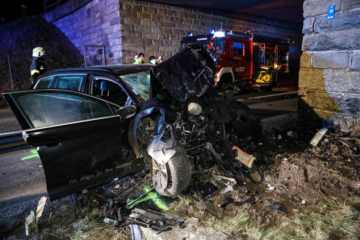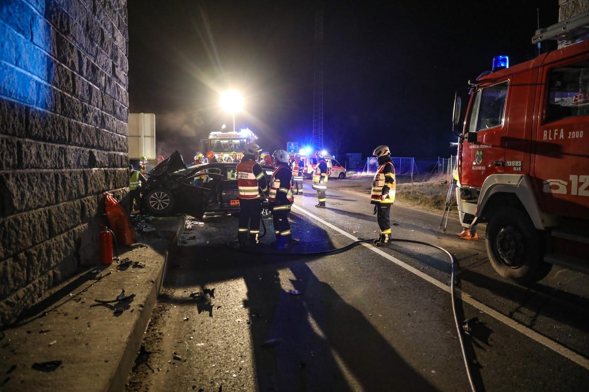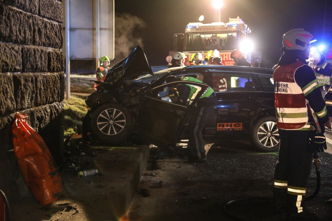 Der Unfall ereignete sich auf der Marchtrenker Straße Richtung Allhaming. Ein PKW prallte aus bisher unbekannter Ursache gegen die Autobahnunterführung.